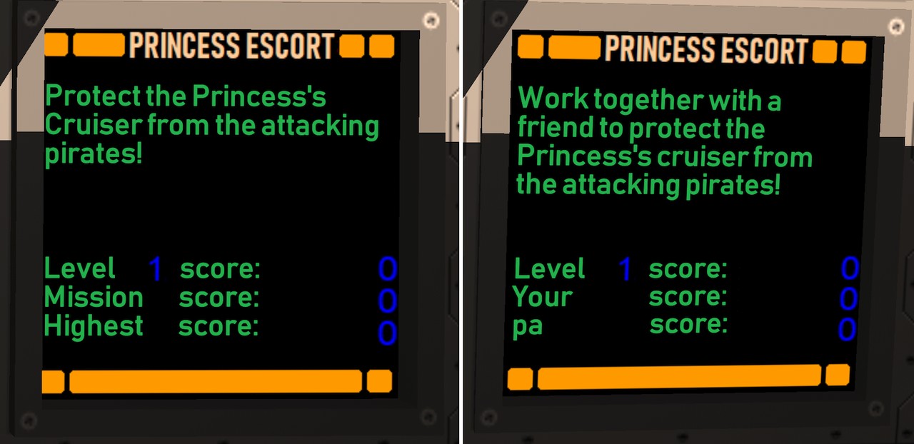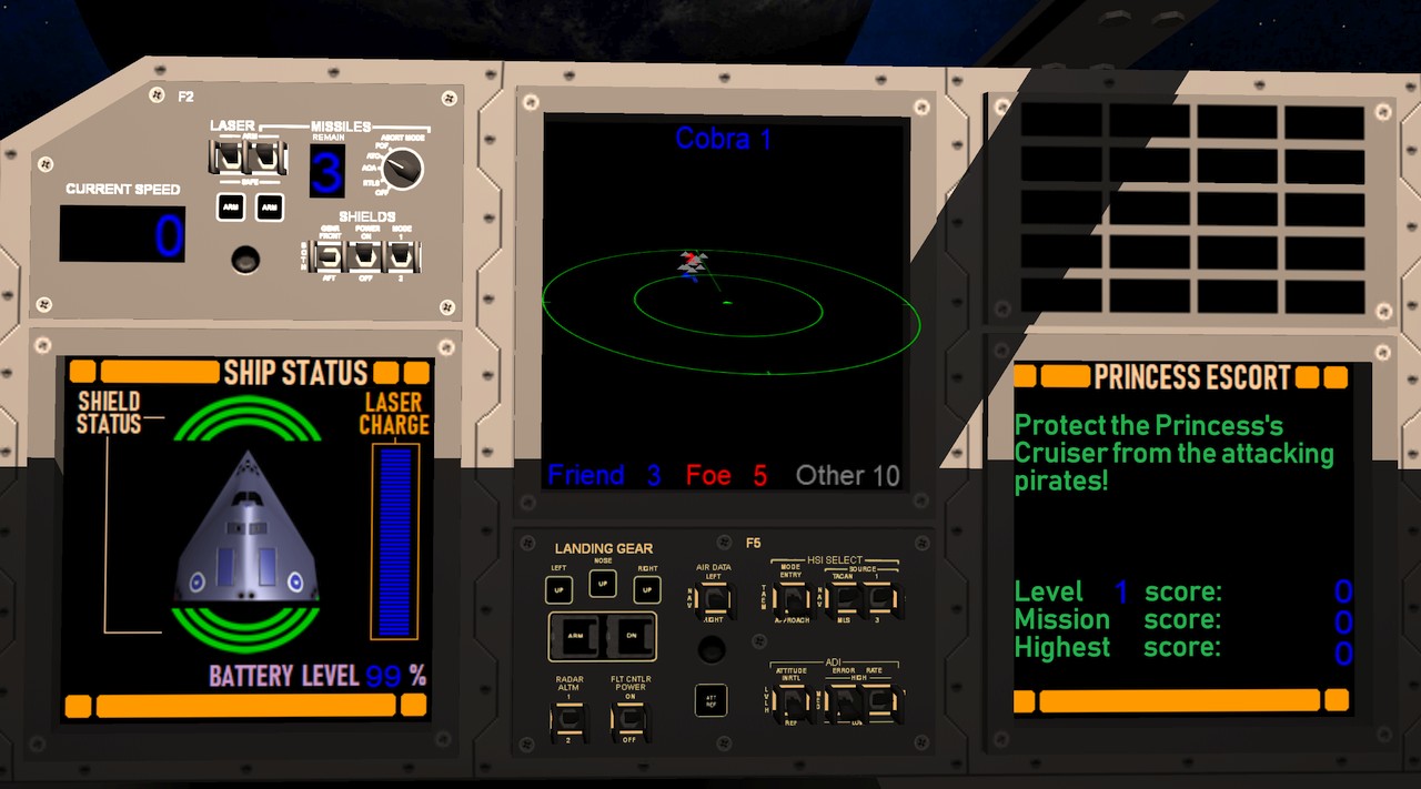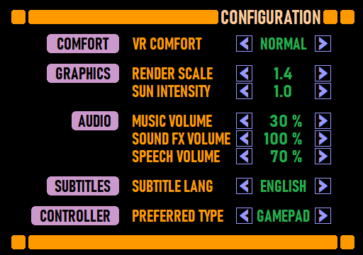 I got some feedback from the YouTube video I published along the previous blog post. One suggestion that I immediately thought was a good idea, was to change the order of the display panels. It would make more sense that the forward displays would show the play instructions on the left and the mission select on the right, so that immediately when a new player launches the game, they see the instructions. Originally the left panel contained the configuration, which I then moved to the far left. This way both the left panels contain configuration stuff, the leftmost panel has the main configuration and the rightmost the controller configuration.