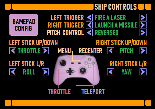 Anyways, I made the D-Pad left/right cause teleporting, and up/down to affect throttle. The horizontal X and B buttons also do the teleporting, while the Y button on the gamepad centers view. The A button fires a laser, as I could not think of what else it should do. The stick functionality is configurable, so you can adjust them to your liking.