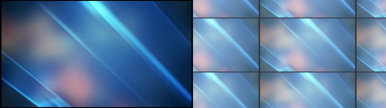 b = FFMpegSource2("Beautiful_Slide_4K_Motion_Background_Loop.mp4").ConvertToRGB32() b = b.AddBorders(5,3,5,3) b = StackHorizontal(b, b, b) b = StackVertical(b, b, b) b = b.Lanczos4Resize(960, 540) b = b.Crop(100, 120, 640, 360) b = b.ConvertFPS(26) b = b.SelectEvery(2,0) b = b.AssumeFPS(8) b = b.Trim(0,31) b = b.Levels(0, 1.5, 255, 50, 255)