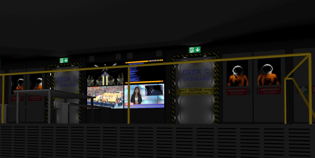 I found from www.pexels.com some footage from a basketball game, so I used that as the contents of another TV screen. The top TV screens show a camera feed from the hangar deck, and a scrolling log display panel feed. Here below is an image of what the central area of the back wall now looks like when viewed from the player seat. Some global illumination and ambient lighting setup is still missing or unfinished.