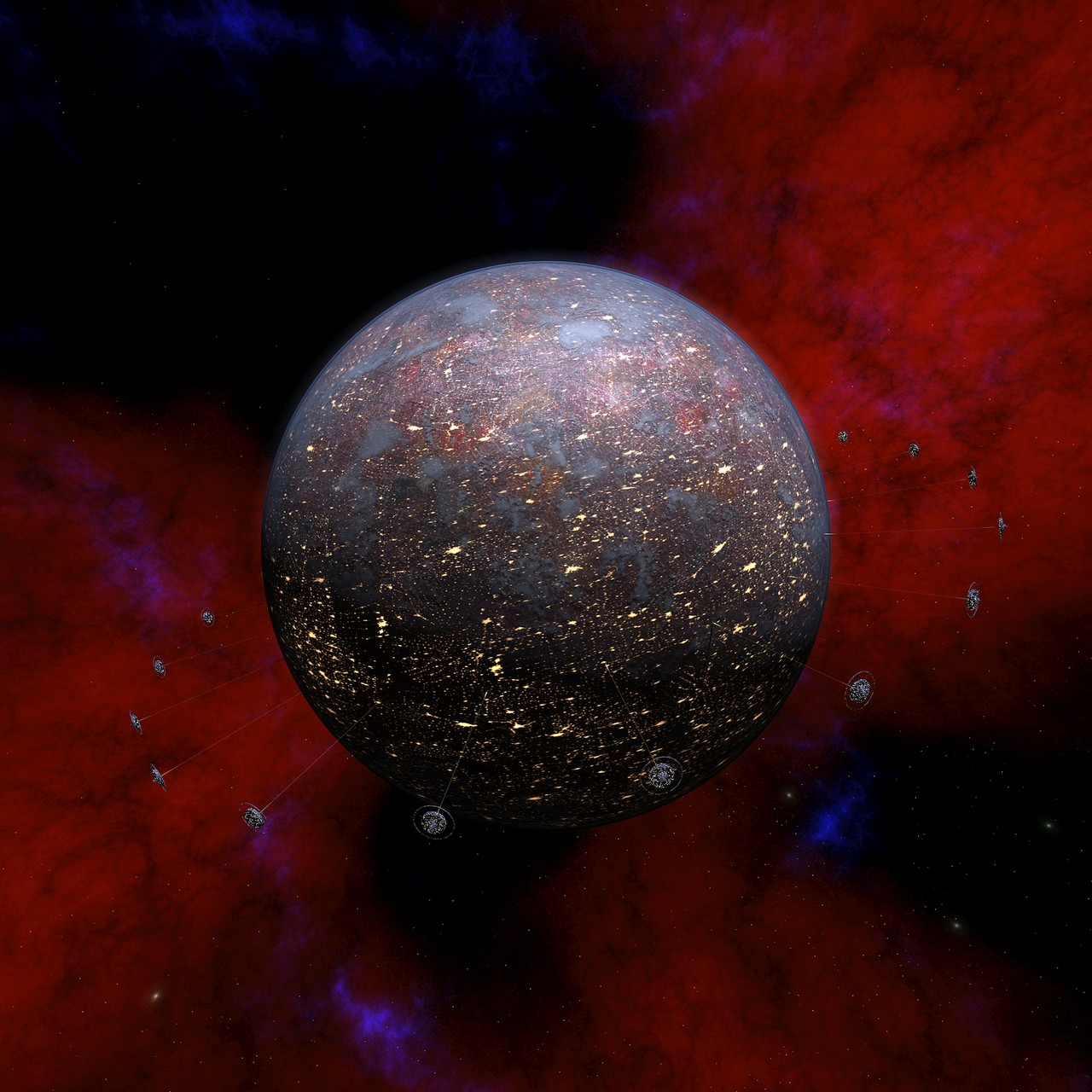 I only had one skybox missing from my game, the skybox for mission 8. I had been thinking about various ideas for a skybox for this mission, but had not yet managed to decide what I want for it. Now it was getting to be high time to decide on it, so I started by figuring out whether the background should contain a blue or red nebula. I noticed that I had a red background in missions 1, 2 and 7, while all the rest (except mission 9, which happens around Earth) have blue nebula background. So, mission 8 should have red nebula background, for balance. But what should be the main feature (planet or something like that) of that skybox?