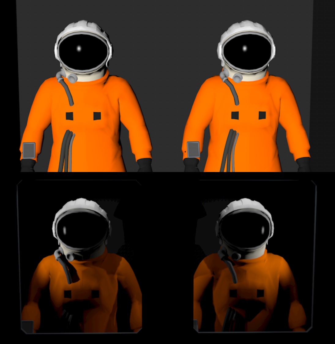 I first looked for some royalty-free space suit images, but those turned out to be difficult to find, and their lighting was never suitable for what I wanted. So, plan B was to find (or model myself) a simple space suit, and then render that to a texture. I did not want to include actual space suit meshes into my space station bridge, as the suits are pretty far (around 11 meters behind) from the player, so you would not see them properly as 3D anyways. They do never even get any sunlight either, so the lighting will stay constant. I should be able to get by with some flat imposter meshes for the space suits.